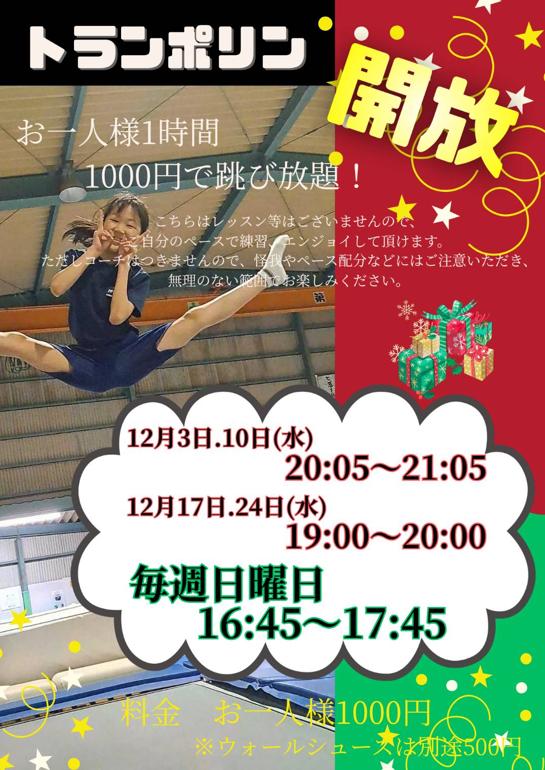 埼玉草加店 【草加店】ウォールトランポリン短期&トランポリン開放企画のご案内 2025.11.23 12月のウォール短期&トランポリン開放企画のお知らせです! ウォール短期のお申込みはこちら トランポリン開放のお申込みはこちら